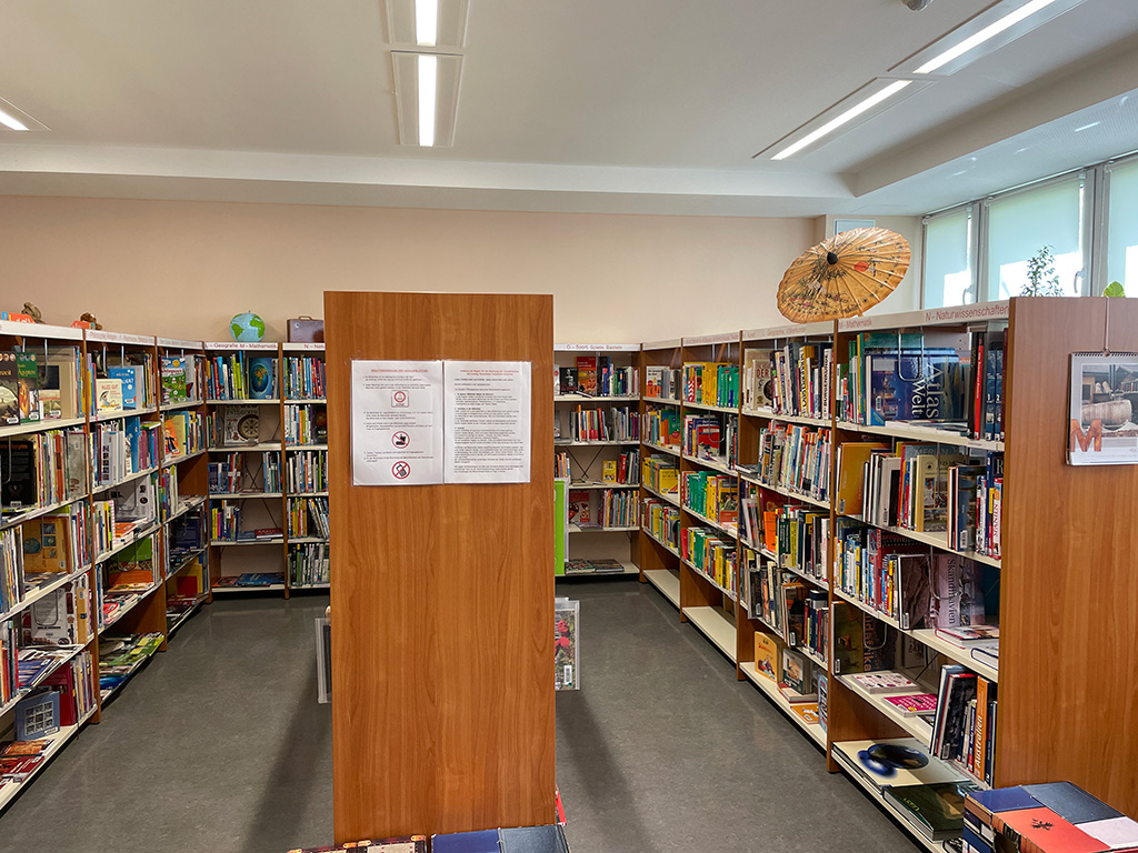 Schüler und Lehrer finden in der Bibliothek während des ganzen Schultages die für ihre Arbeit erforderlichen Medien in Form von Sachbüchern und Fachzeitschriften sowie elektronischen Medien wie Hörbücher und DVDs.