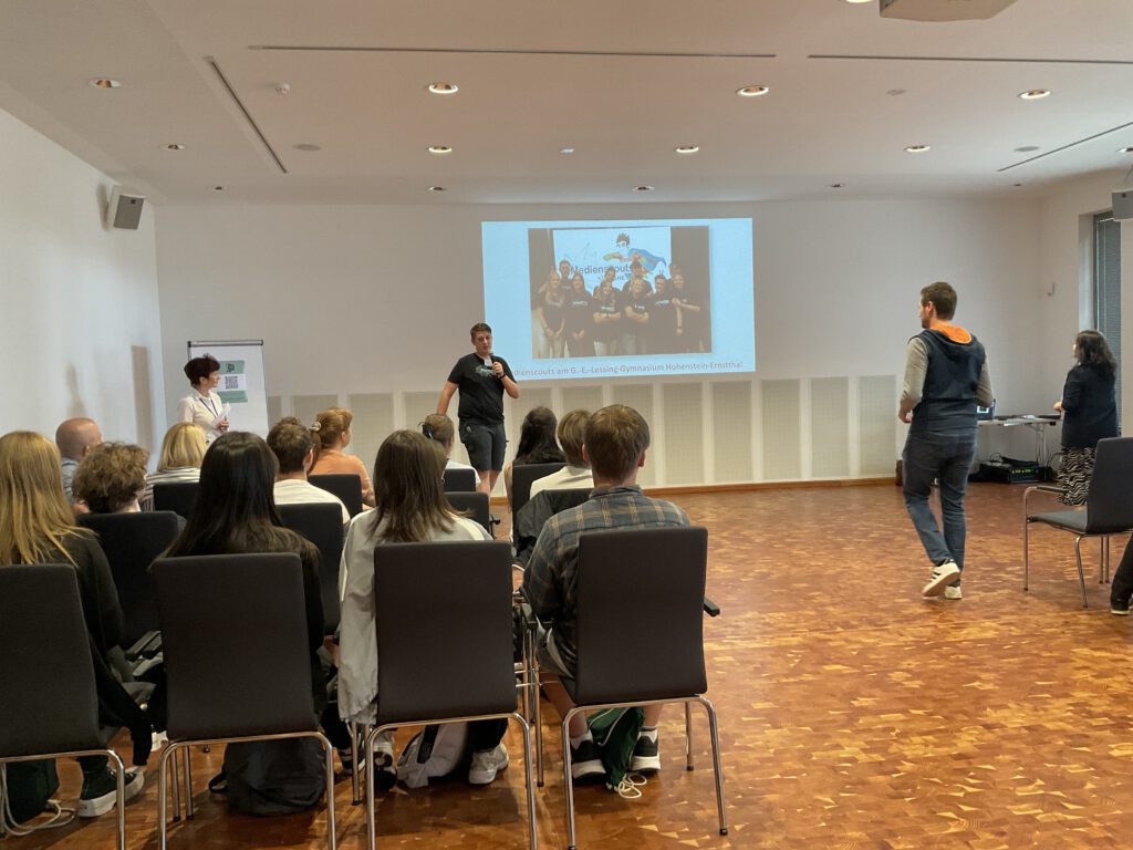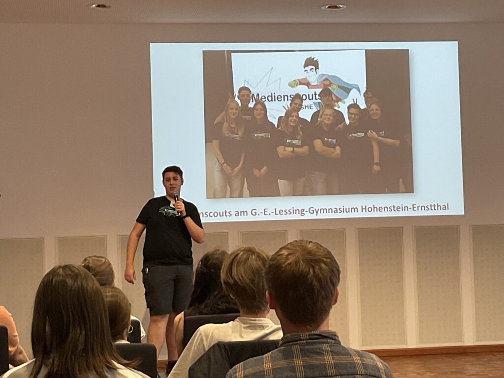 Am 28. Juni 2023 fand das 1. Medienscout-Netzwerktreffen Sachsens statt. Fünf Me- dienscouts unseres Gymnasiums fuhren nach Radebeul und nahmen an unterschied-lichen Workshops teil, z.B. Hate-Speech, Fake-News, Rhetorik, Gamification, Selbst-darstellung im Netz.