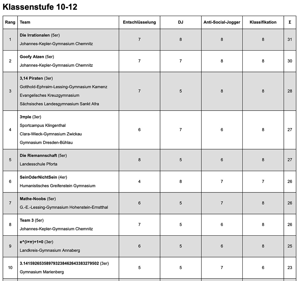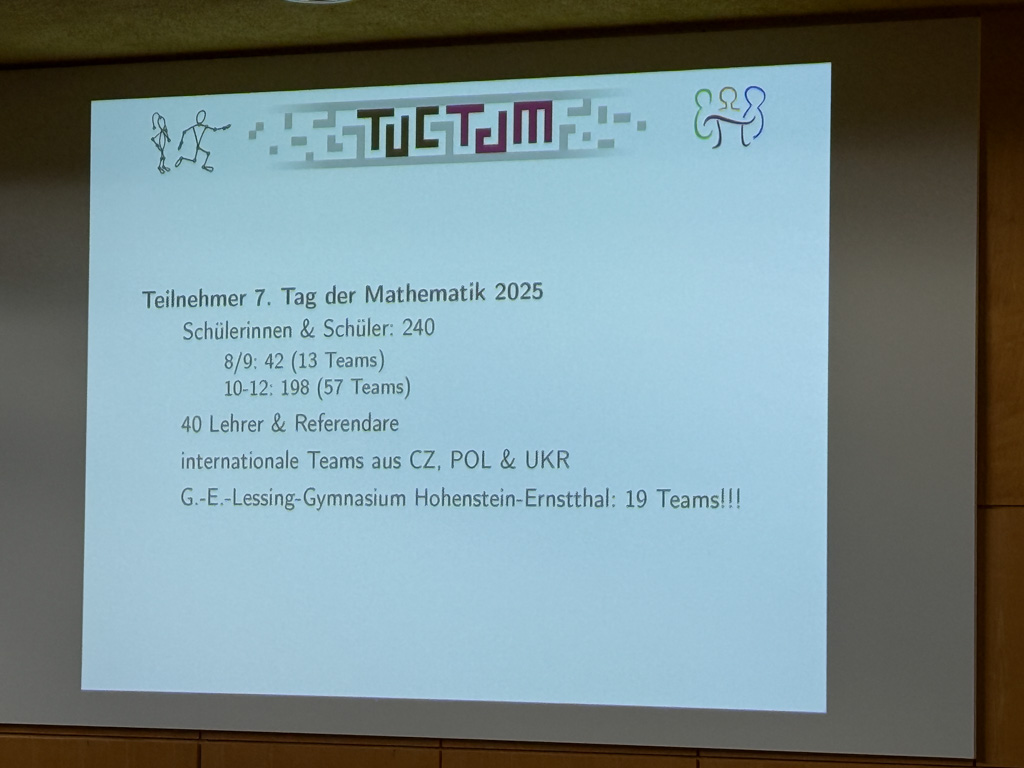 „Es war eine wunderbare Atmosphäre – voller Energie, Neugier und Begeisterung“, erzählt Prof. Dr. Alois Pichler, Dekan der Fakultät für Mathematik. Besonders stolz ist er auf die große Beteiligung: 240 Schülerinnen und Schüler traten in 70 Teams im Teamwettbewerb der Klassenstufen 8/9 sowie 10 bis 12 an. „Man konnte sehen, wie Mathematik Menschen verbindet – über Schulformen, Altersgruppen und sogar Ländergrenzen hinweg.“Besonders engagiert zeigte sich das Gotthold-Ephraim-Lessing-Gymnasium Hohenstein-Ernstthal, das mit stolzen 19 Teams vertreten war.