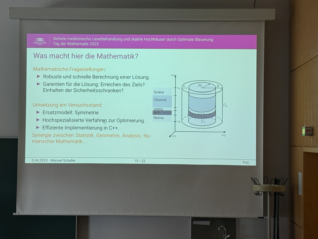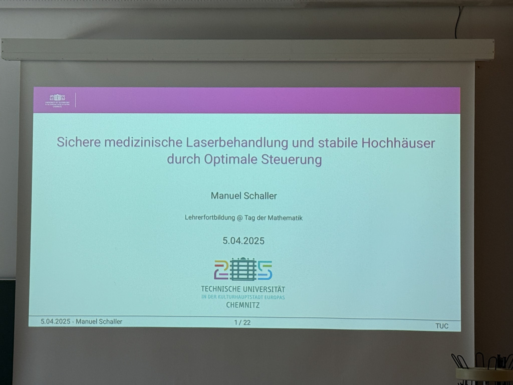 Prof. Dr. Oliver Ernst, Inhaber der Professur für Numerische Mathematik, nahm die Teilnehmenden mit auf eine Reise in die Welt des Schätzens und Testens – und zeigte, wie viel Mathematik hinter scheinbar intuitiven Entscheidungen steckt. Anschließend sprach Jun.-Prof. Dr. Manuel Schaller über die Bedeutung von Verlässlichkeit und Stabilität – veranschaulicht durch faszinierende Anwendungsbeispiele wie medizinische Laserbehandlungen und die Steuerung stabiler Hochhäuser.