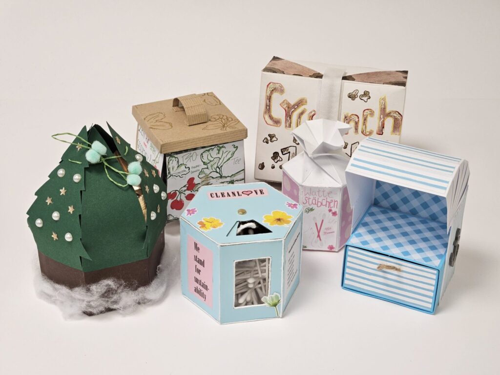 Mit viel Geduld, Kreativität und über viele Stunden Gestaltungsarbeit entstanden durchdachte und liebevoll gestaltete Modelle, die die Jury überzeugte. So zum Beispiel das Modell von Kiara Arnold – die einen Ministrandkorb als Verpackung für Teebeutel gestaltete, oder die wieder befüllbare Box für Wattestäbchen mit Drehmechanismus von Hanna Ohlendorf. Johanna Jentzsch und Annalina Kupfer gestalteten ebenfalls eine Box für Wattestäbchen, jedoch mit ausgeklügeltem Faltverschluss, der sich immer wieder öffnen und verschließen lässt.